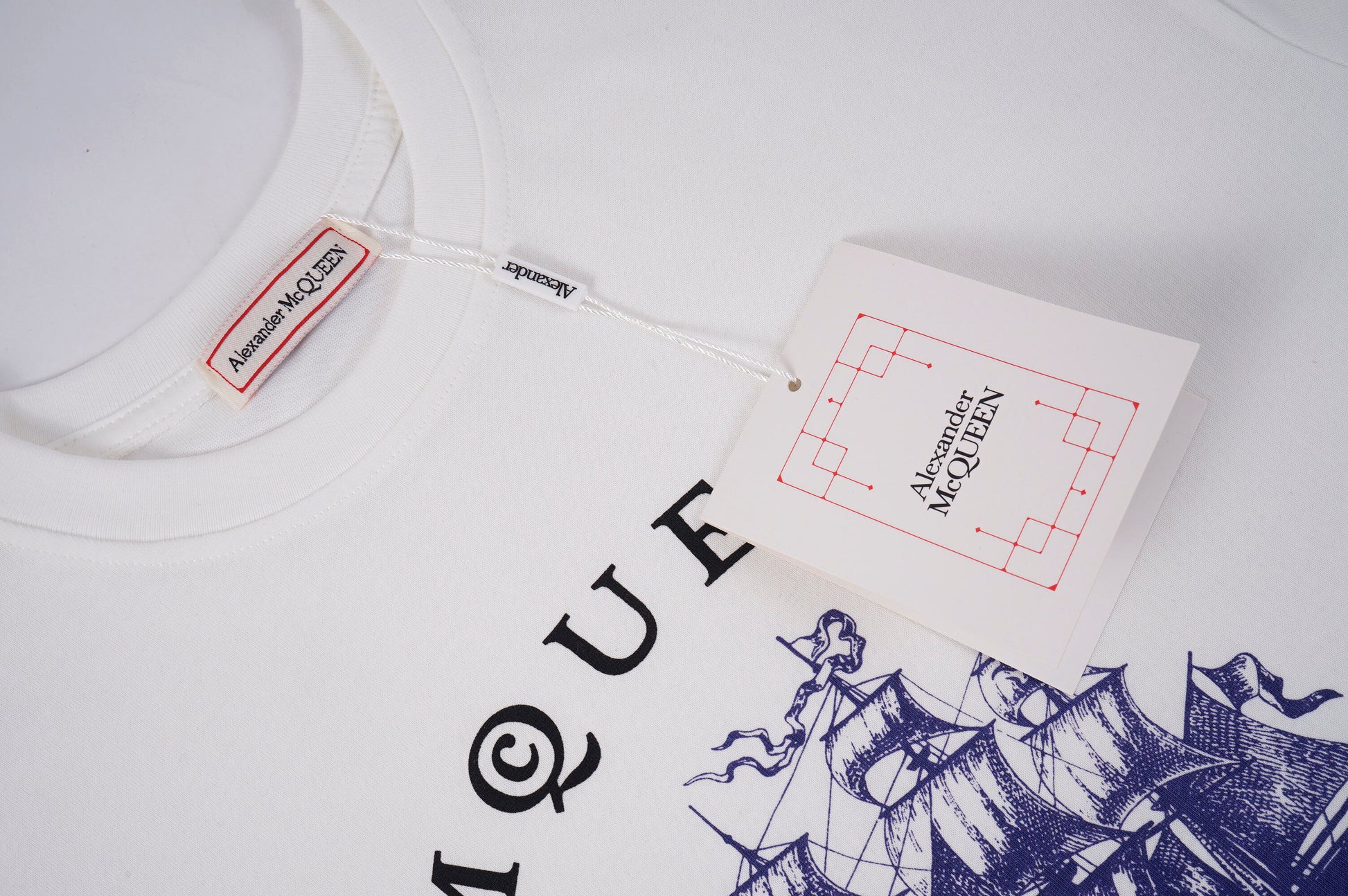 This replica Alexander McQueen white T - shirt features bold “MQUEEN” lettering and an intricate sailing ship graphic. Crafted from premium cotton, it offers a comfortable, relaxed fit. Ideal for adding a touch of luxury streetwear style to your wardrobe, it pairs well with jeans or shorts. Perfect for fashion enthusiasts seeking iconic designer pieces with nautical - inspired details, enhancing your casual looks with high - end fashion flair.