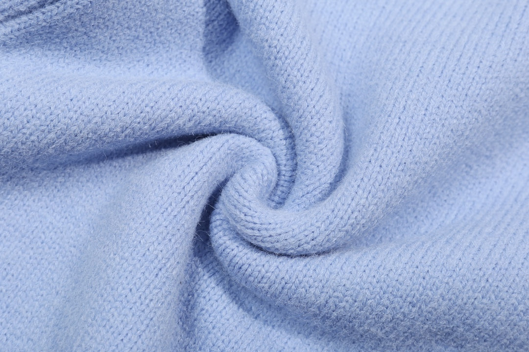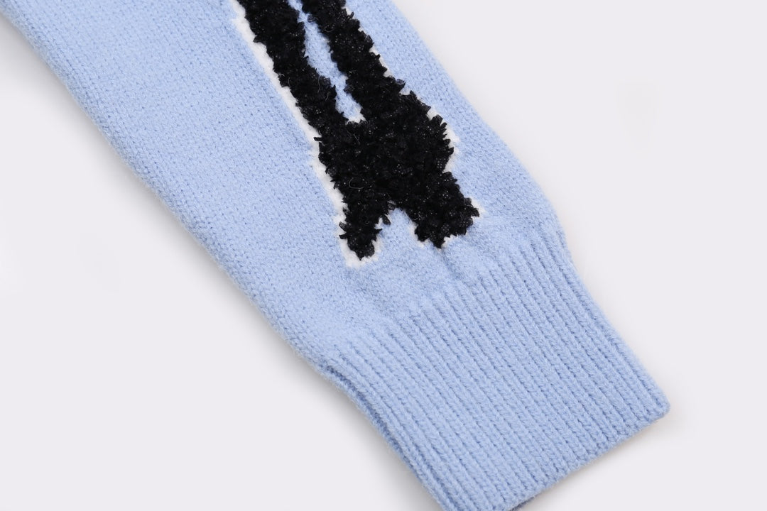 Replica Amiri men's light blue V - neck cardigan with skeleton print details, featuring subtle brand embroidery, crafted from soft knit fabric for comfort, ideal for layering in cooler weather and bold casual styling, a top choice for men seeking luxury streetwear with distinctive design.
