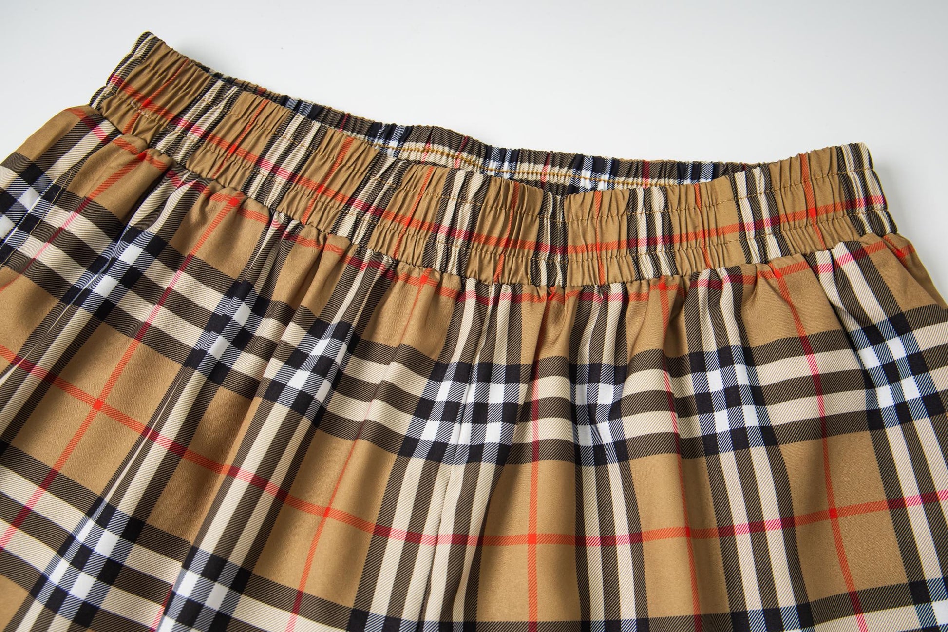 replica Burberry shorts, showcasing the iconic beige checkered pattern. With elastic waist for snug fit, crafted from lightweight fabric perfect for summer, ideal for casual outings beach trips, blending Burberry's luxury aesthetic with comfort, a great choice for fashion - forward men seeking branded summer shorts.