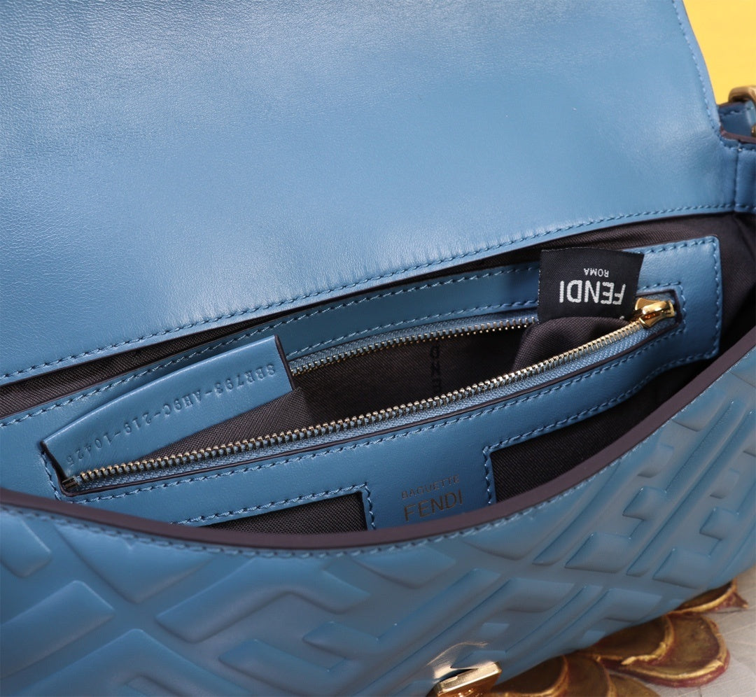 This chic replica Fendi Baguette bag features an eye - catching embossed FF pattern on soft blue leather, complemented by luxurious gold - tone hardware. The structured silhouette and adjustable strap make it perfect for adding a touch of high - end fashion to any ensemble. Ideal for fashion enthusiasts, it combines classic Fendi design with modern elegance, offering both style and practical storage for daily essentials.