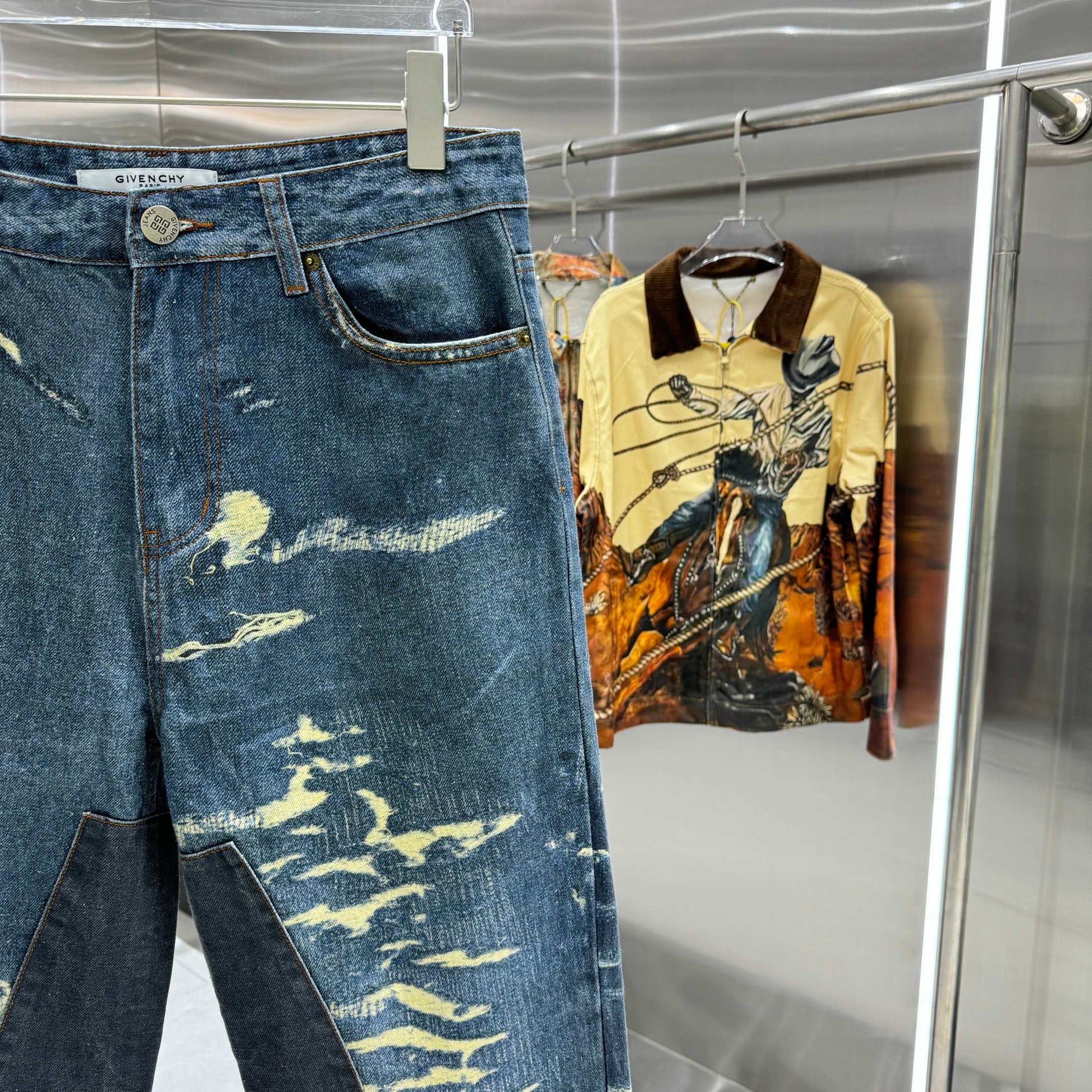 replica Givenchy jeans with unique distressing and patchwork, made of top - notch denim, offering comfort and trendy silhouette, ideal for fashion lovers aiming to make a statement in Givenchy denim.