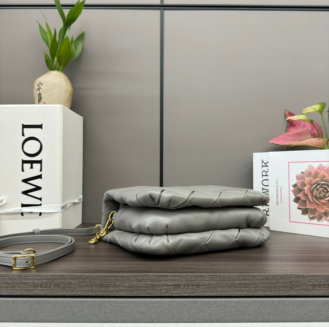 This replica Loewe crossbody bag features a gray quilted leather design, highlighted by elegant gold - tone brand accents. It comes with a detachable chain strap and an adjustable leather strap, offering versatile styling options. Perfect for adding a touch of luxury to any outfit, ideal for fashion - forward individuals seeking high - end accessories that blend sophistication and functionality.