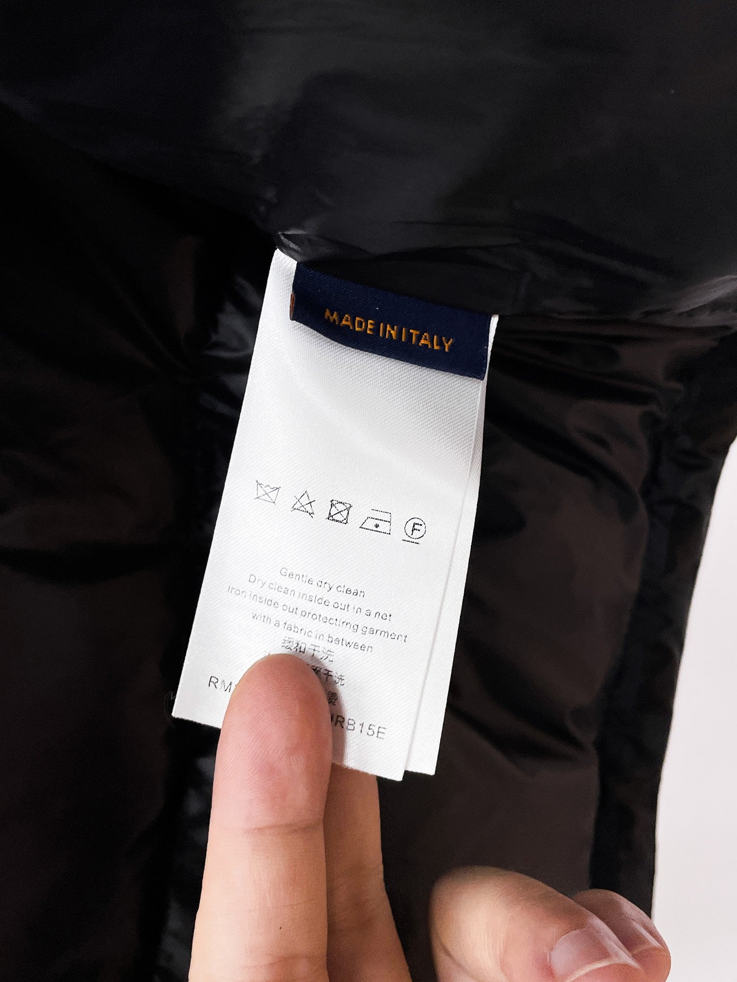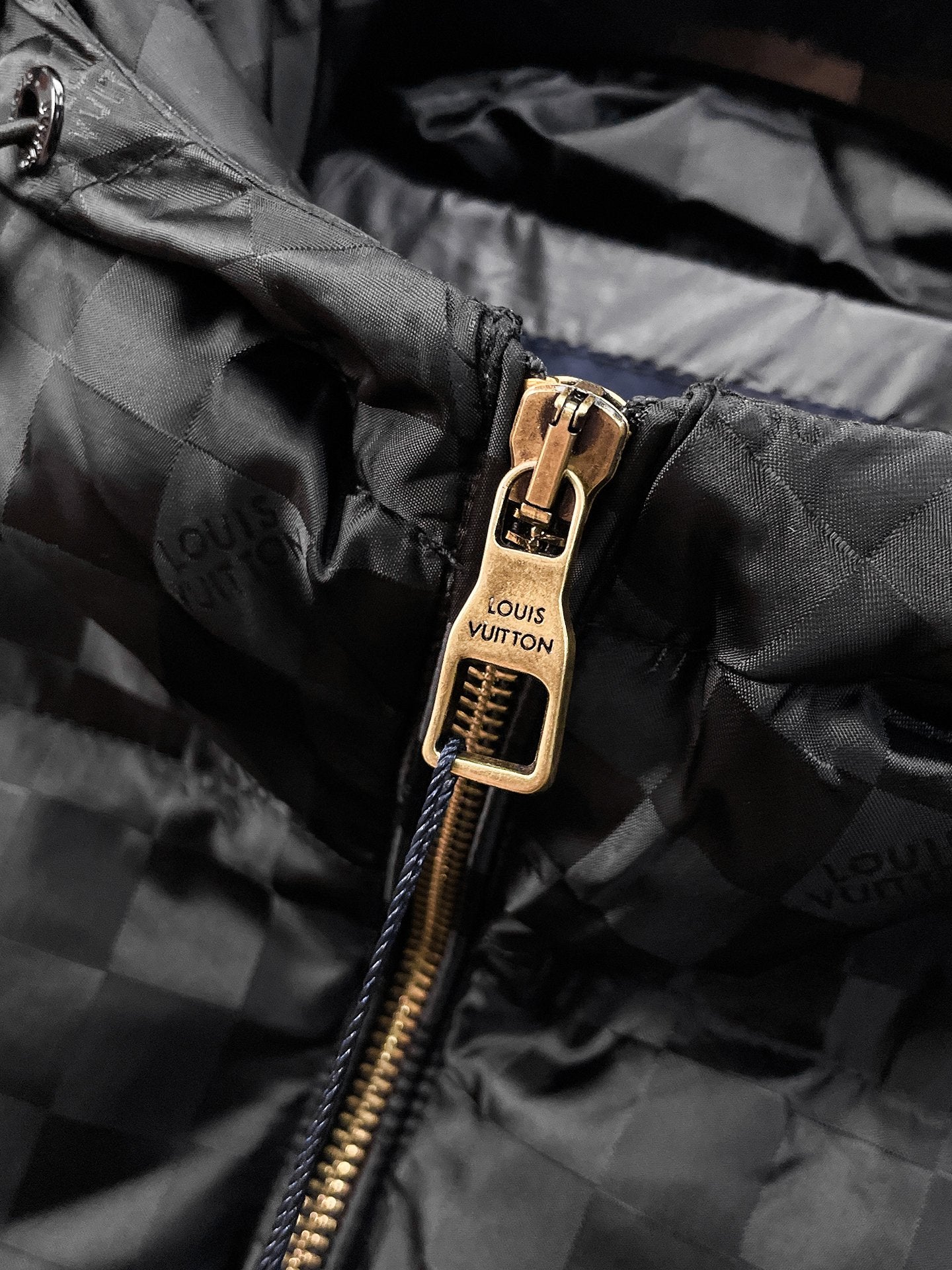 Replica Louis Vuitton down jacket with brand patch, made from high - quality materials for cold - weather warmth and fashion, ideal for luxury winter outerwear seekers who love checkered patterns.