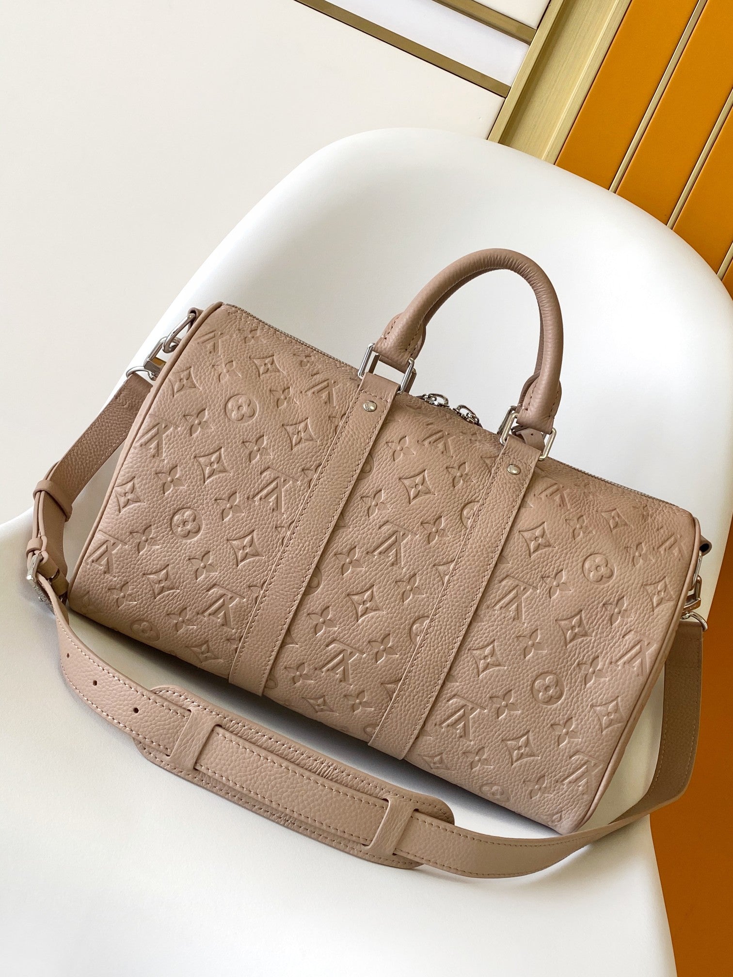 Discover the elegant replica Louis Vuitton Embossed Leather Keepall Bandoulière Bag. Crafted in soft beige, it features iconic LV monogram embossing, durable handles, and a removable strap. Perfect for travel or everyday use, adding a touch of luxury to any ensemble. Ideal for fashion - forward individuals seeking high - end accessories.