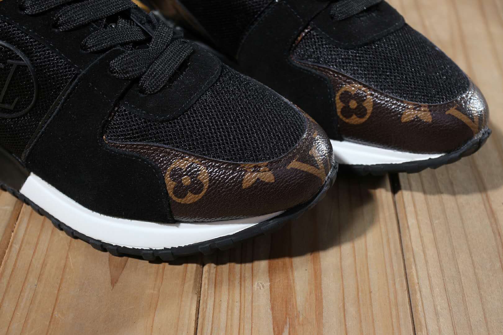Replica Louis Vuitton women's fashion sneakers with gold accents and signature patterns, blending black fabric and classic prints, offering comfort and style for elevating casual daily looks, perfect for fashion - forward women.