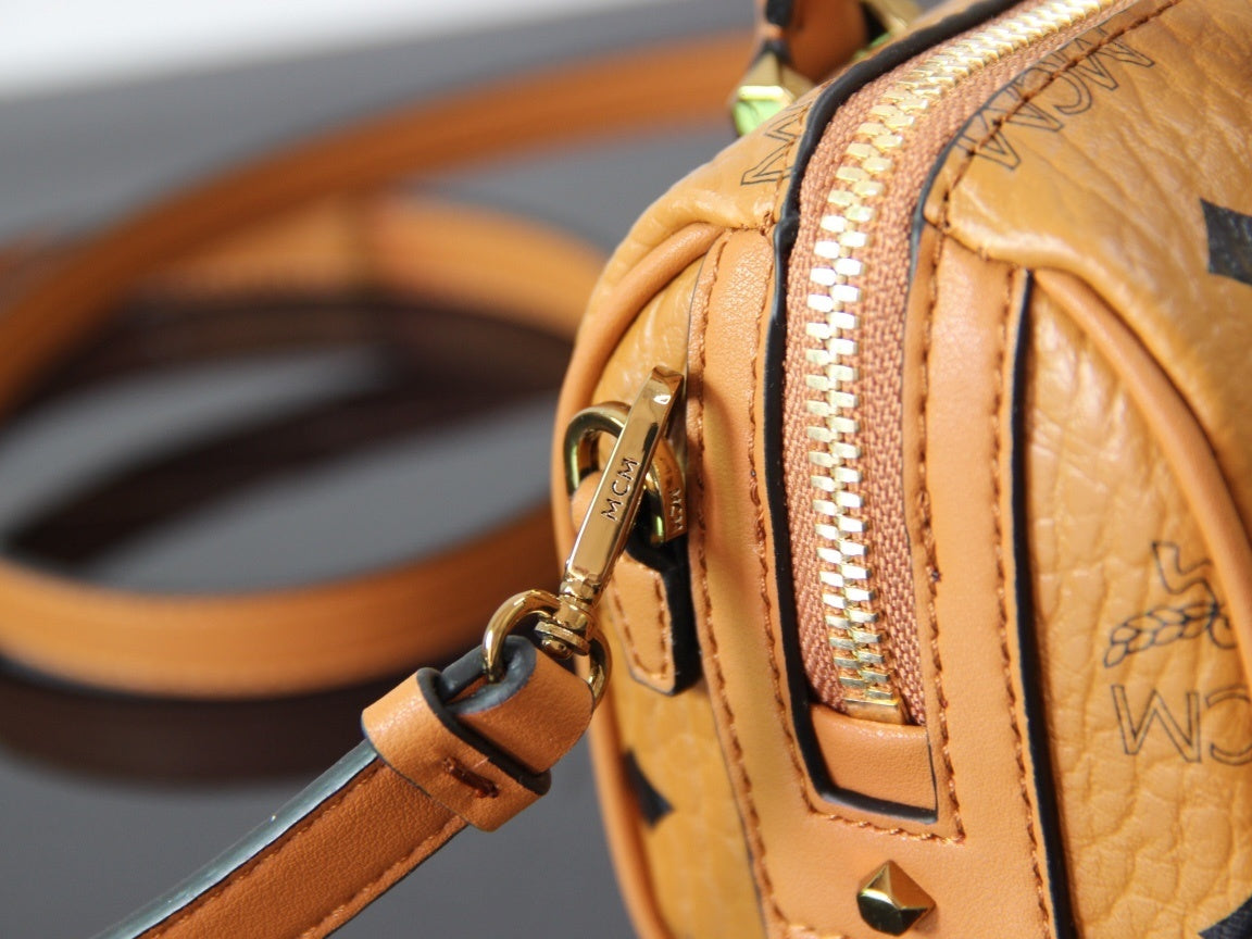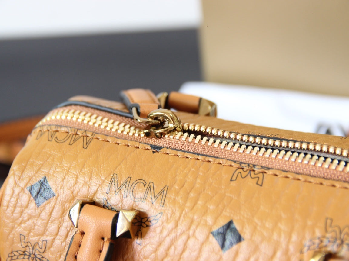 This replica MCM mini Boston bag showcases brown Visetos coated canvas with the signature monogram. It has a top handle, detachable shoulder strap, and a metal logo plate, blending classic design and versatility. Perfect for fashion enthusiasts to carry essentials in style, suitable for daily outings or as a chic accessory.