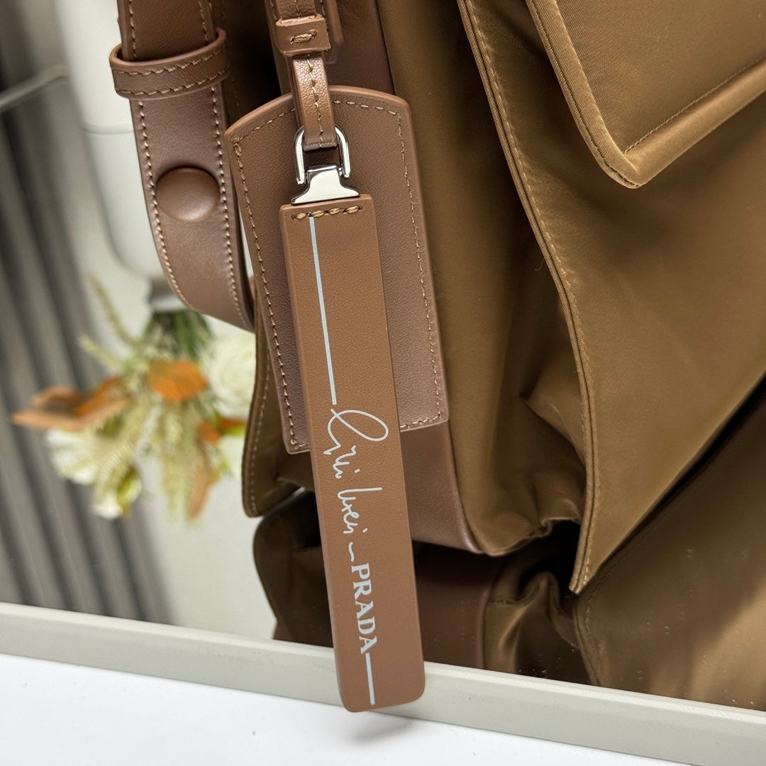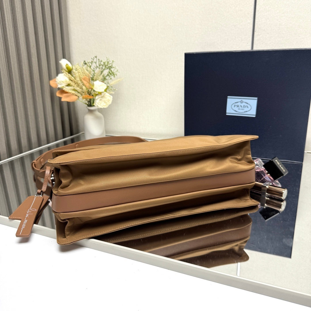 This replica Prada crossbody bag combines beige nylon with leather trim, featuring the iconic triangular logo. It has a fold - over design and an adjustable strap, offering a blend of durability and style. Ideal for those seeking a practical, high - end accessory for daily use, perfect for commuting or casual outings.