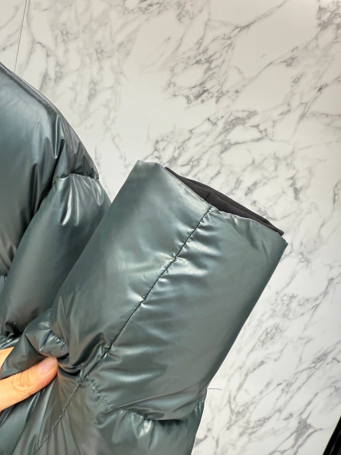 Replica Prada down jacket with triangle logo, crafted from premium materials for cold - weather warmth and fashionable look, ideal for luxury winter outerwear seekers who love unique colors and extra comfort.