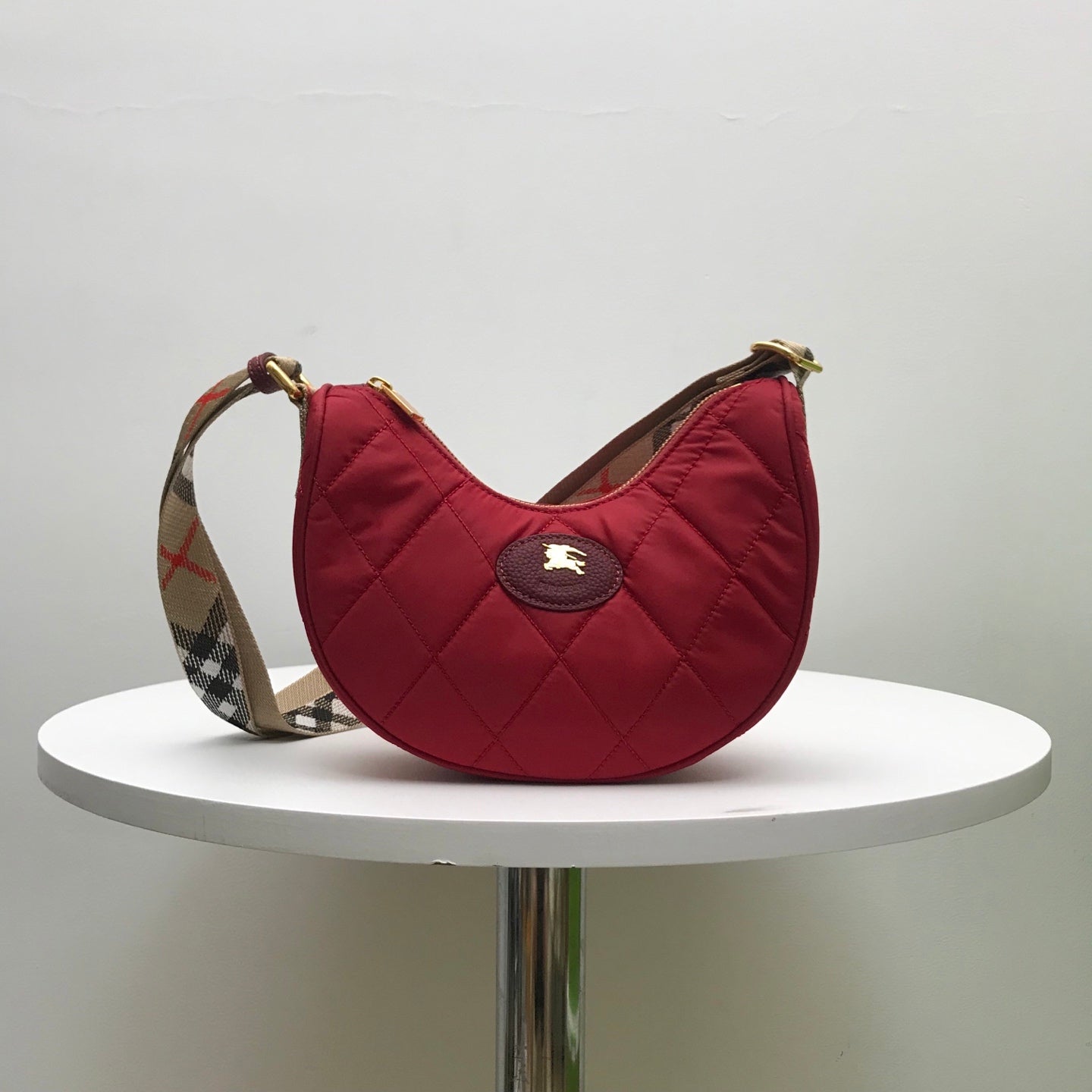 Stylish Black/Red Quilted Burberry Crescent Bag With Checkered Strap And Gold Logo Style No.235