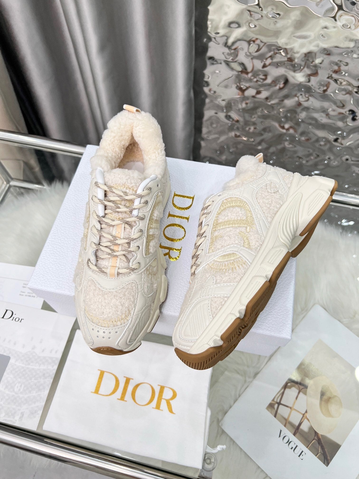 replica Women's Dior sneakers with luxurious design, plush fleece elements, soft fleece lining, textured upper for warmth and comfort, durable sole, elegant branding, blending high - end fashion with practicality for daily wear and stylish winter outfits.