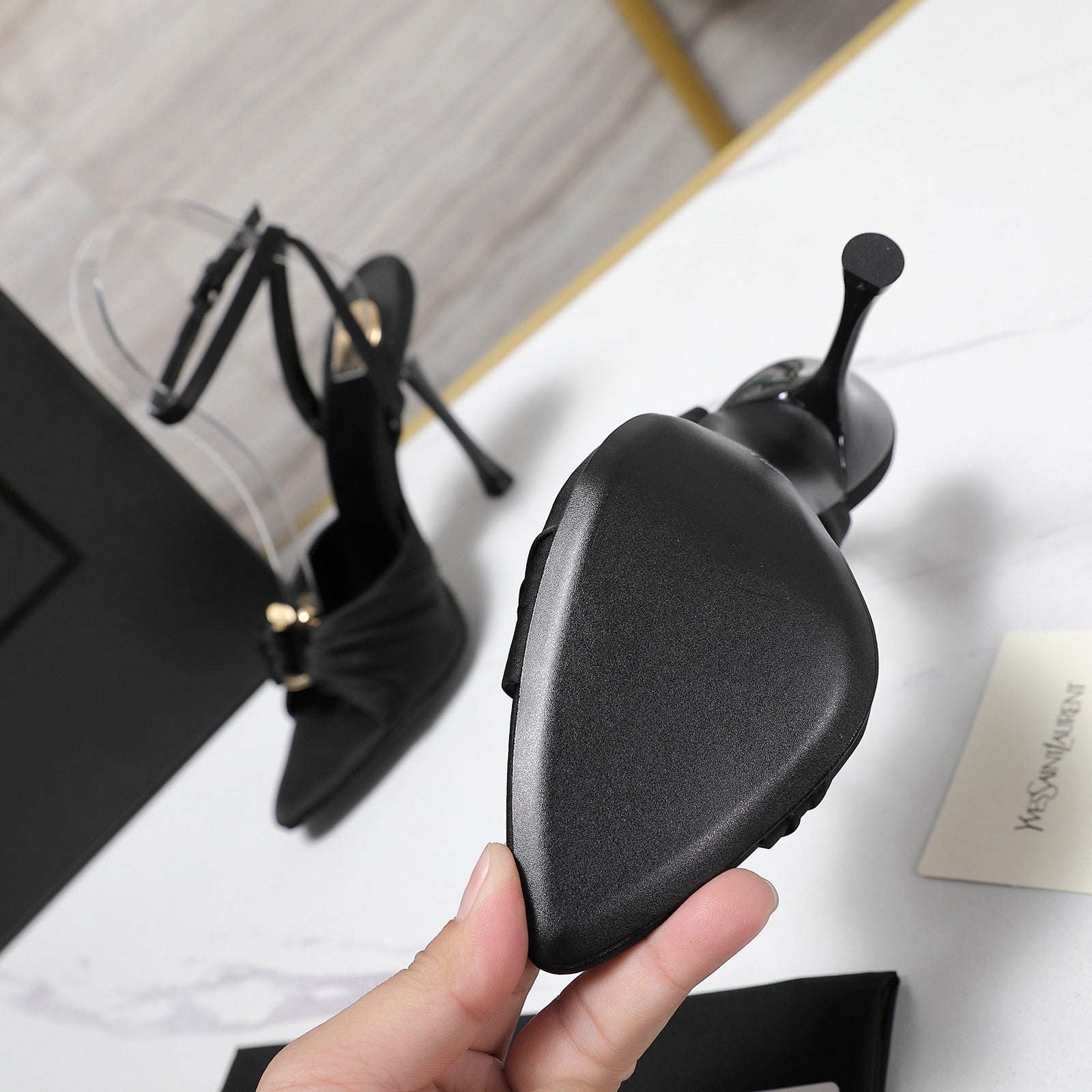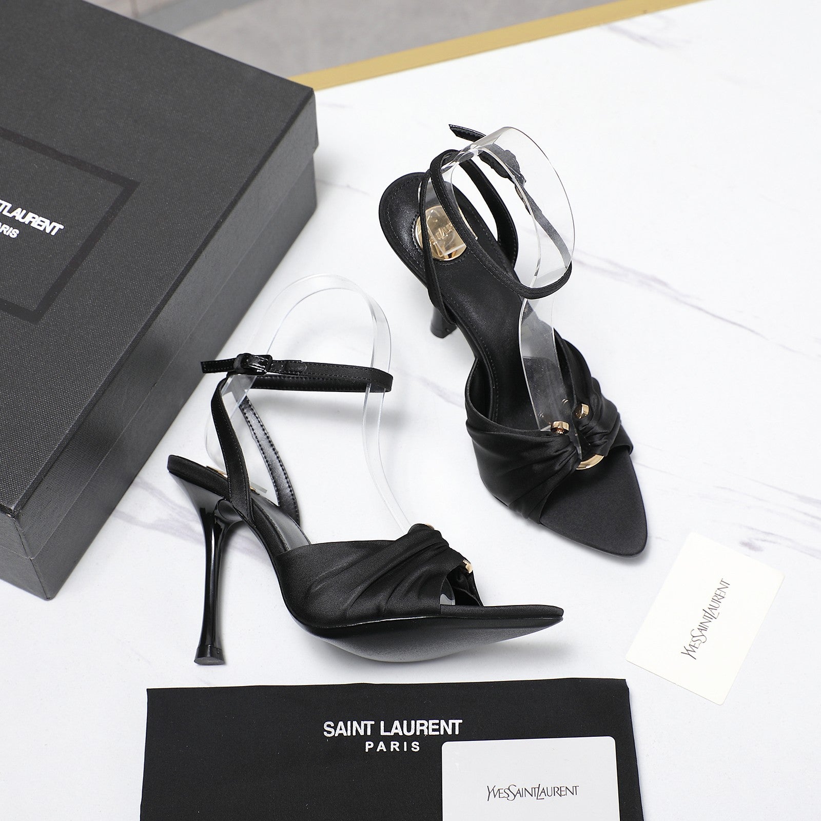 YSL black satin ankle - strap high - heel sandals present an elegant design. Crafted from smooth satin, they feature chic knot details and adjustable ankle straps for a tailored fit. Ideal for adding a touch of luxury to evening events or formal gatherings, these sandals combine comfort with high - end fashion appeal.